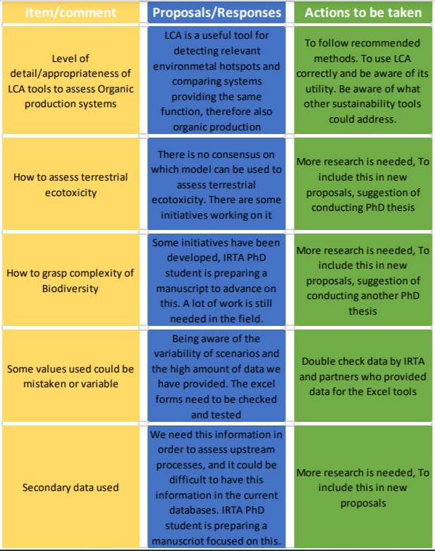 Some very interesting discussions took place during the session – the table below summarises the most important points discussed/commented on, including answers and actions required. It can be concluded that there are clear benefits to the LCA method in terms of comparisons and hotspot analysis, but due to the complexity of assessing environmental questions, more research is needed to adapt it to organic production. In particular, more work is needed on biodiversity indicators and terrestrial ecotoxicity impacts.