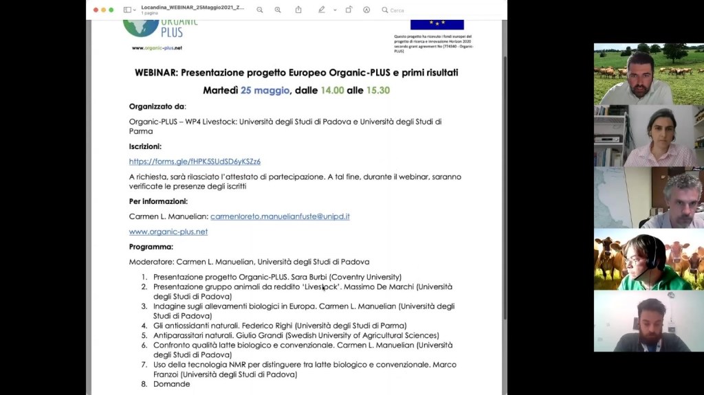 On 25th of May 2021, the University of Padova (UNIPD) and the University of Parma (UNIPR) organised a webinar to present the first results of several trials conducted at UNIPD, UNIPR, and the Swedish University of Agricultural Sciences (SLU). After overviews of the wider Organic-PLUS project from Dr. Sara Burbi of Coventry University (CU) and of the Livestock workpackage from Dr. Massimo De Marchi (UNIPD), a range of results were discussed, including: outcomes of the survey of organic livestock producers across 13 European countries, from in-vitro studies with natural antioxidants and antiparasitics, the differences in milk composition between organic and conventional farming systems, and from research on NMR technologies to discriminate organic from conventional milk.